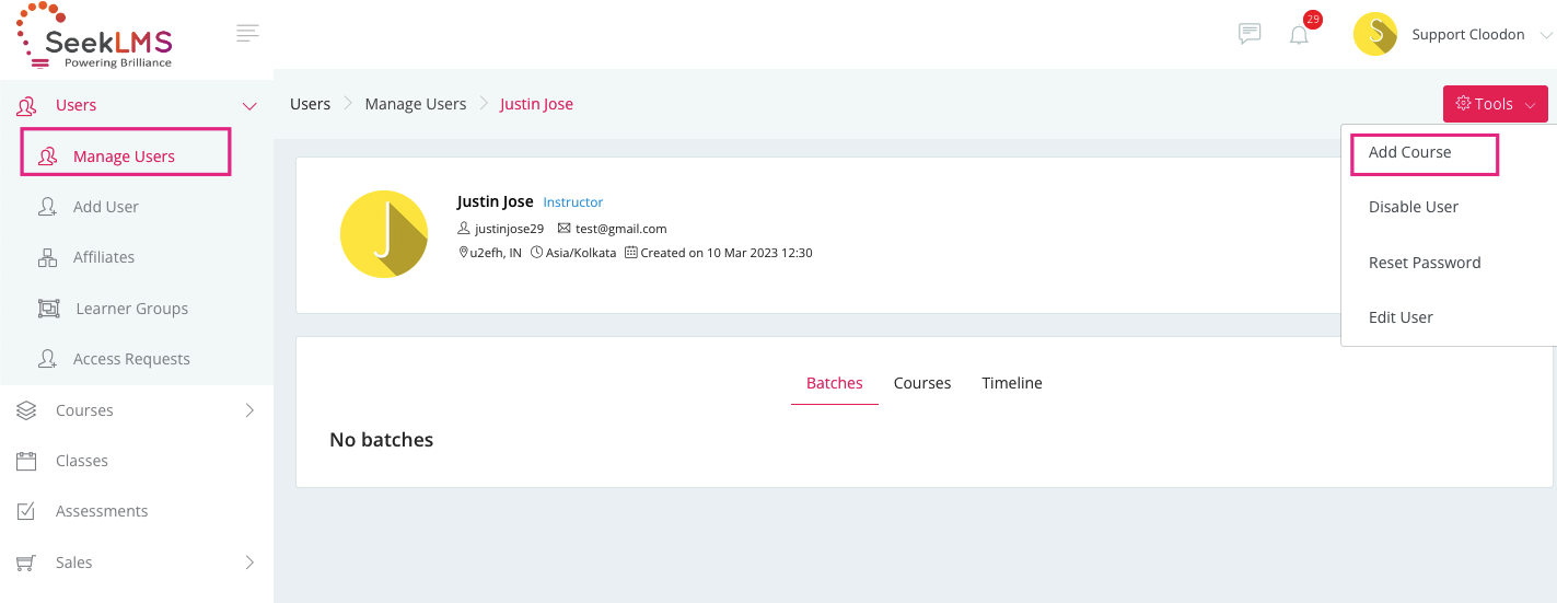 To change instructor for a batch, an affiliate manager has to: Click on “Courses” and select “Batches” Click on the batch for which the instructor is to be changed. Once done, click on “Settings” and choose “Instructors” Here, you can: You can change ...